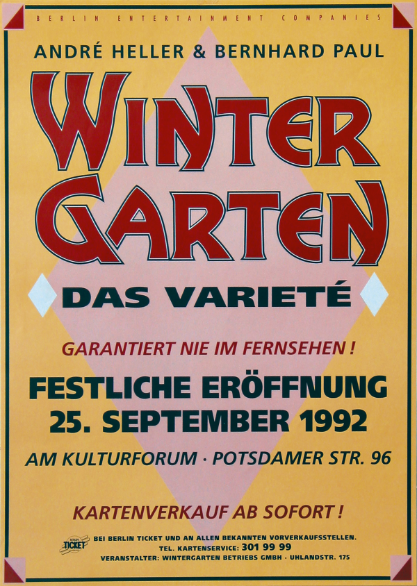 Am 25. September 1992 wurde das Berliner Wintergarten Varieté an der Potsdamer Straße als glanzvolle Hommage an den historischen Wintergarten in der Friedrichstraße wiedereröffnet und hat seitdem seinen festen Platz als kulturelles Highlight in der Hauptstadt.